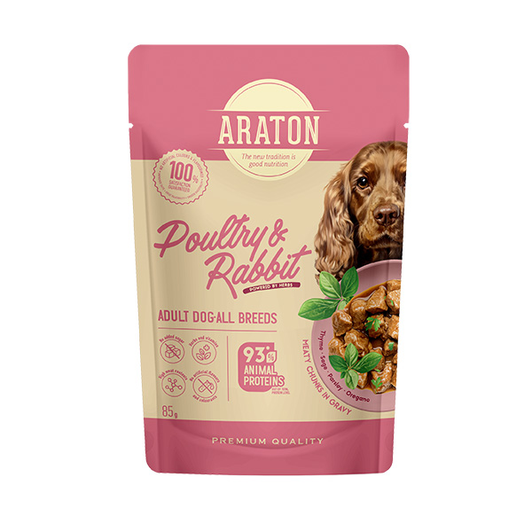 Araton Adult Poultry and Rabbit to pełnoporcjowa mokra karma przeznaczona do codziennego żywienia dorosłych psów wszystkich ras. Delikatne kawałki drobiu i królika w aromatycznym sosie zapewniają wysoką smakowitość, lekkostrawność oraz odpowiedni poziom energii na każdy dzień. Karma może być stosowana samodzielnie lub jako uzupełnienie diety opartej na karmie suchej.