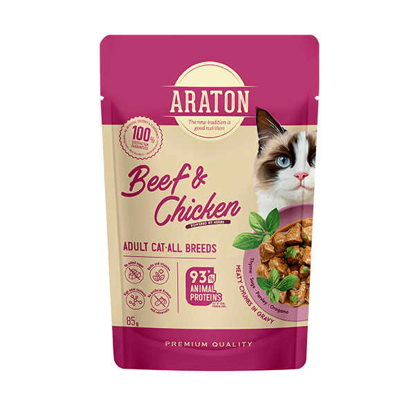 Araton Adult Cat Beef and Chicken to pełnoporcjowa mokra karma opracowana z myślą o codziennym żywieniu dorosłych kotów każdej rasy. Delikatne kawałki wołowiny i kurczaka w aromatycznym sosie zapewniają wysoką smakowitość, lekkostrawność i pełne wsparcie energii. Karma może być podawana samodzielnie lub jako uzupełnienie karmy suchej.