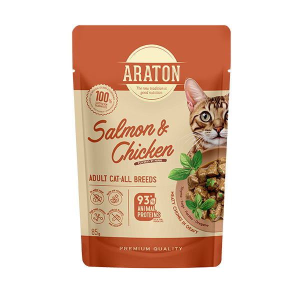 Araton Adult Cat Salmon and Chicken to pełnoporcjowa mokra karma opracowana z myślą o codziennym żywieniu dorosłych kotów każdej rasy. Delikatne kawałki łososia i kurczaka w aromatycznym sosie zapewniają wysoką smakowitość, lekkostrawność i pełne wsparcie energii. Karma może być podawana samodzielnie lub jako uzupełnienie karmy suchej.