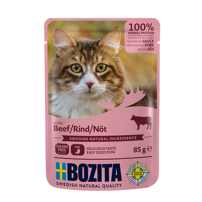 Bozita kawałeczki w sosie z wołowiną to pełnowartościowa karma mokra dla kota w formie kawałków mięsa w sosie. Karma jest bezzbożowa, a mięso użyte do produkcji pochodzi z wyselekcjonowanych szwedzkich gospodarstw. Smak szwedzkiej wołowiny gwarantuje wyjątkowo wysoką smakowitość karmy.