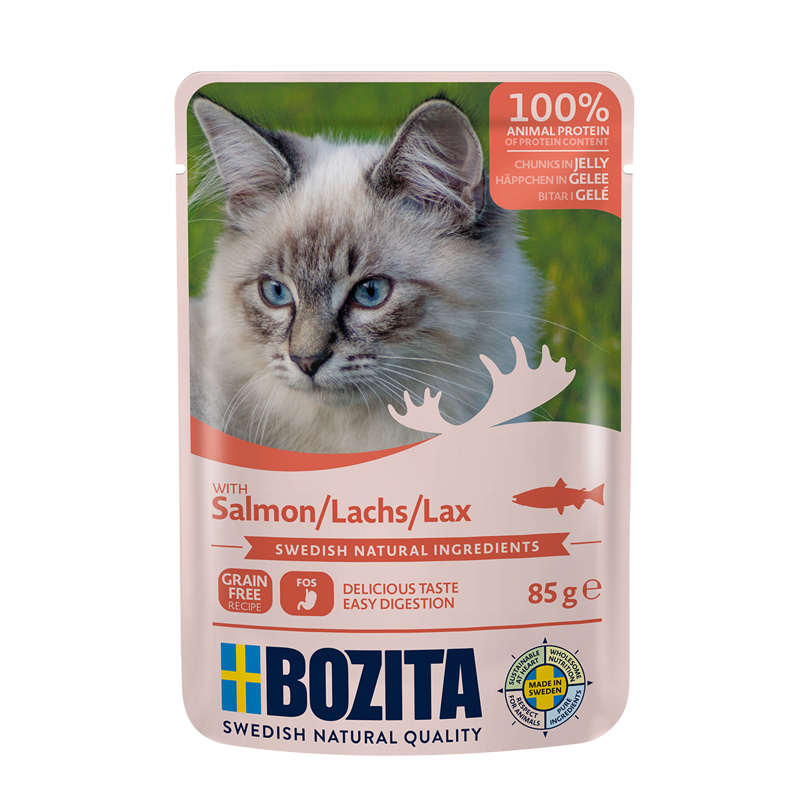 Bozita kawałki w galaretce z łososiem to pełnowartościowa karma mokra dla kota w formie kawałków mięsa w galaretce. Karma jest bezzbożowa, a mięso użyte do produkcji pochodzi z dzikich akwenów na północy Szewcji. Zawiera 100% białka zwierzęcego, ważne kwasy Omega-3 DHA I EPA oraz FOS (naturalne włókno prebiotyczne wspomagające zdrowe jelita). Karma wyróżnia się wysoką smakowitością.