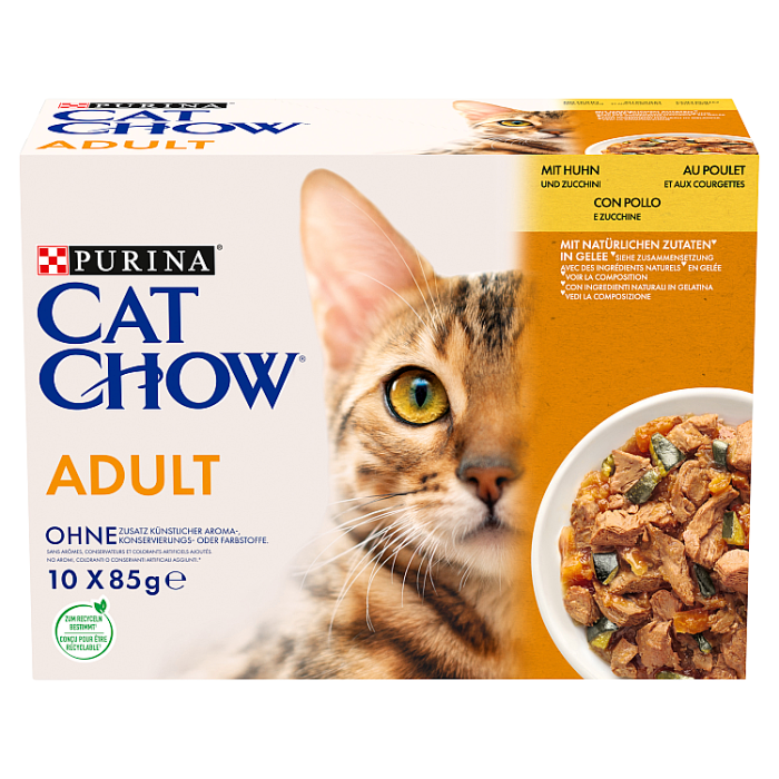 Purina Cat Chow z kurczakiem i cukinią to pełnowartościowa, mokra karma w galaretce, przeznaczona dla dorosłych kotów. Delikatne kawałki z naturalnymi składnikami, bez dodatku sztucznych aromatów, barwników i konserwantów.