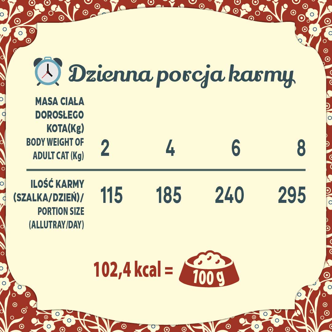 - ALL MEAT (75% Sarniny): Wysoka zawartość mięsa – lekkostrawnego, delikatnego, o niskiej zawartości tłuszczu i cholesterolu.