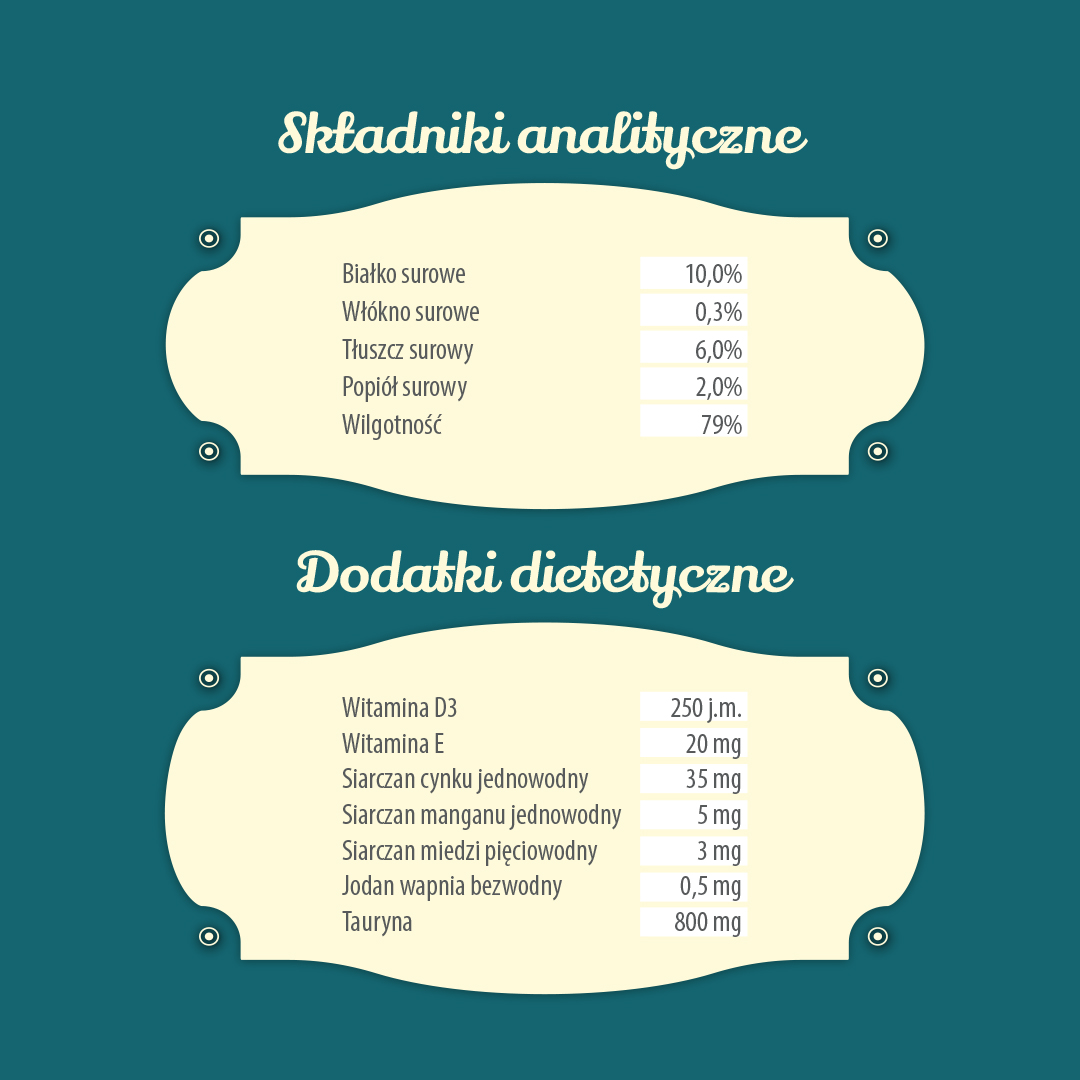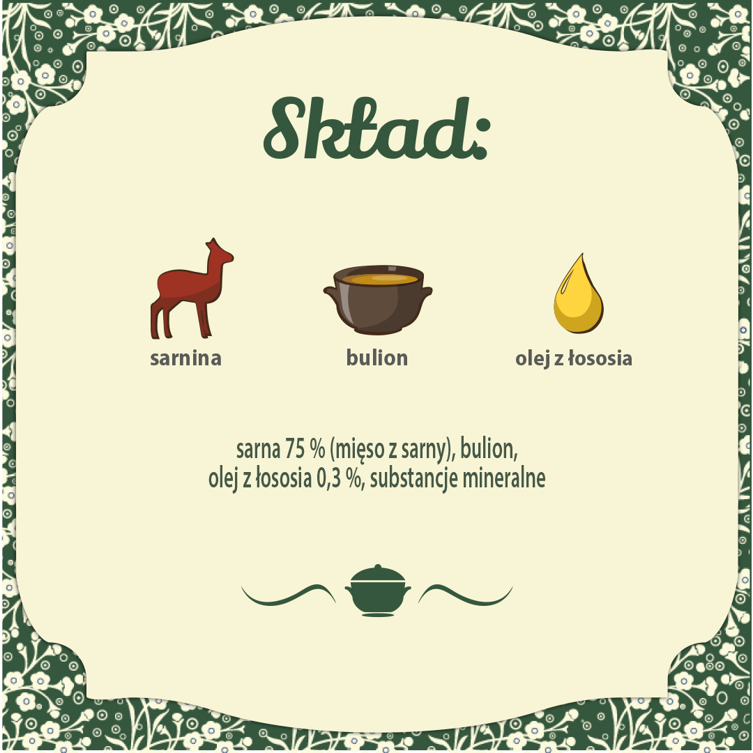 Skład: sarnina 75% (mięso z sarny), bulion, olej z łososia 0,3%, substancje mineralne.