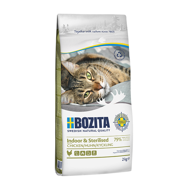 Bozita Indoor & Sterilised to pełnoporcjowa, zbilansowana karma sucha dla dorosłych kotów, opracowana specjalnie z myślą o kotach niewychodzących, wysterylizowanych oraz tych, które mają niższe zapotrzebowanie energetyczne. Doskonale sprawdzi się również u kotów starszych oraz kotów łatwo przybierających na wadze.