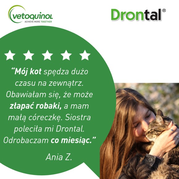 Drontal 230mg + 20mg to tabletki odrobaczające służące zwalczaniu inwazji nicieni i tasiemców przewodu pokarmowego kotów, takich jak: Toxocara cati, Ancylostoma tubaeforme, Ancylostoma braziliense, Echinococcus multilocularis, Dipylidium caninum, Taenia taenieformis, Mesocestoides spp., Joyeuxiella spp.