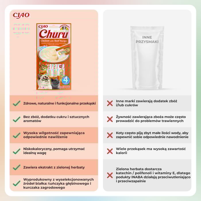 Niskokaloryczna przekąska nie zawiera zbóż, konserwantów i sztucznych barwników. Kremowa konsystencja jest uwielbiana przez koty. Churu jest również dodatkową porcją wody dla kotów mało pijących. Przysmak dostarcza 1/10 kalorii zawartych w suchych przysmakach. Produkt jest całkowicie bezzbożowy oraz wolny od konserwantów i sztucznych barwników.