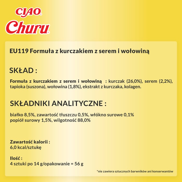 Niskokaloryczna przekąska nie zawiera zbóż, konserwantów i sztucznych barwników. Kremowa konsystencja jest uwielbiana przez koty. Churu jest również dodatkową porcją wody dla kotów mało pijących. Przysmak dostarcza 1/10 kalorii zawartych w suchych przysmakach. Produkt jest całkowicie bezzbożowy oraz wolny od konserwantów i sztucznych barwników.
