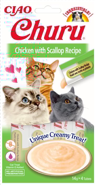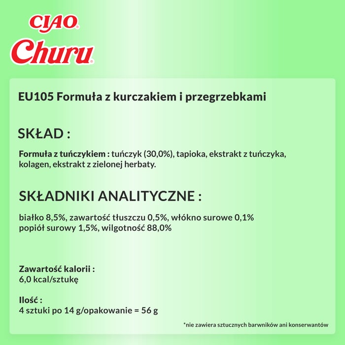 Niskokaloryczna przekąska nie zawiera zbóż, konserwantów i sztucznych barwników. Kremowa konsystencja jest uwielbiana przez koty. Churu jest również dodatkową porcją wody dla kotów mało pijących. Przysmak dostarcza 1/10 kalorii zawartych w suchych przysmakach. Produkt jest całkowicie bezzbożowy oraz wolny od konserwantów i sztucznych barwników.