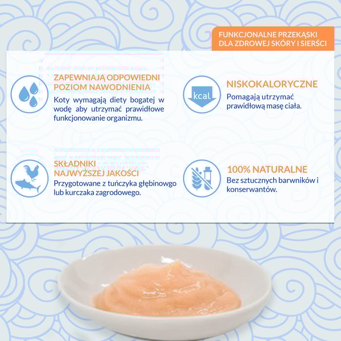 Skład: woda, kurczak, skrobia z tapioki, olej sojowy, naturalny aromat, naturalny aromat z przegrzebków, guma guar, olej rybny, witamina E, tauryna, ekstrakt z zielonej herbaty