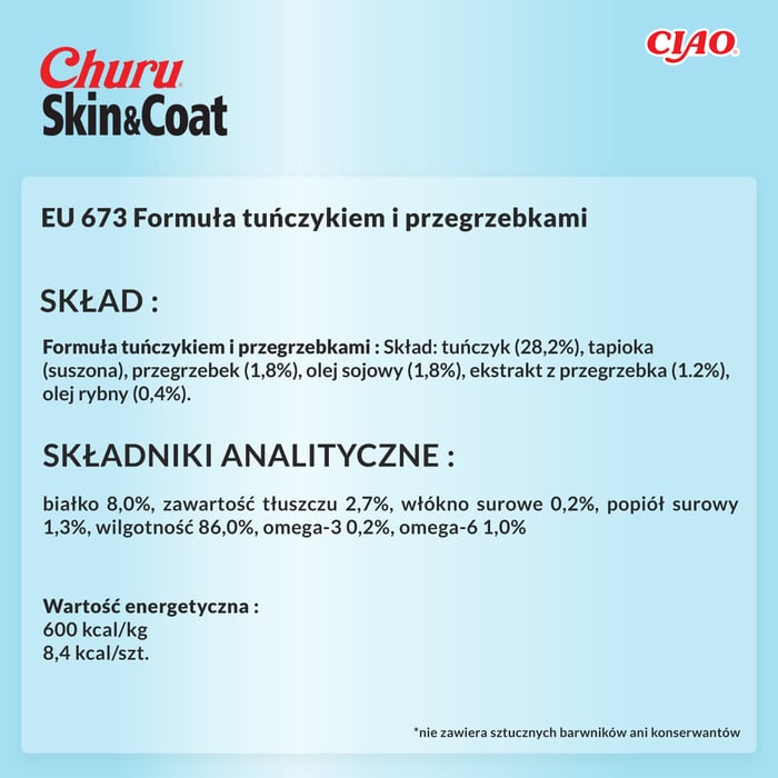 Skład: woda, tuńczyk, skrobia z tapioki, przegrzebki, olej sojowy, naturalny aromat z przegrzebków, naturalny aromat, guma guar, olej rybny, witamina E, tauryna, ekstrakt z zielonej herbaty