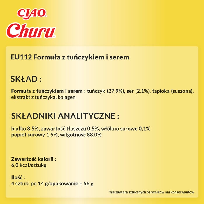 Niskokaloryczna przekąska nie zawiera zbóż, konserwantów i sztucznych barwników. Kremowa konsystencja jest uwielbiana przez koty. Churu jest również dodatkową porcją wody dla kotów mało pijących. Przysmak dostarcza 1/10 kalorii zawartych w suchych przysmakach. Produkt jest całkowicie bezzbożowy oraz wolny od konserwantów i sztucznych barwników.
