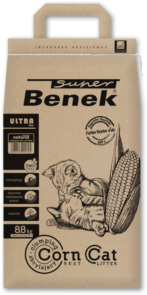 Super Benek Corn Ultra to naturalny, zbrylający się żwirek o naturalnym, delikatnym zapachu kukurydzy. Przeznaczony jest dla dorosłych kotów i kociąt, gryzoni, królików oraz ptaków.