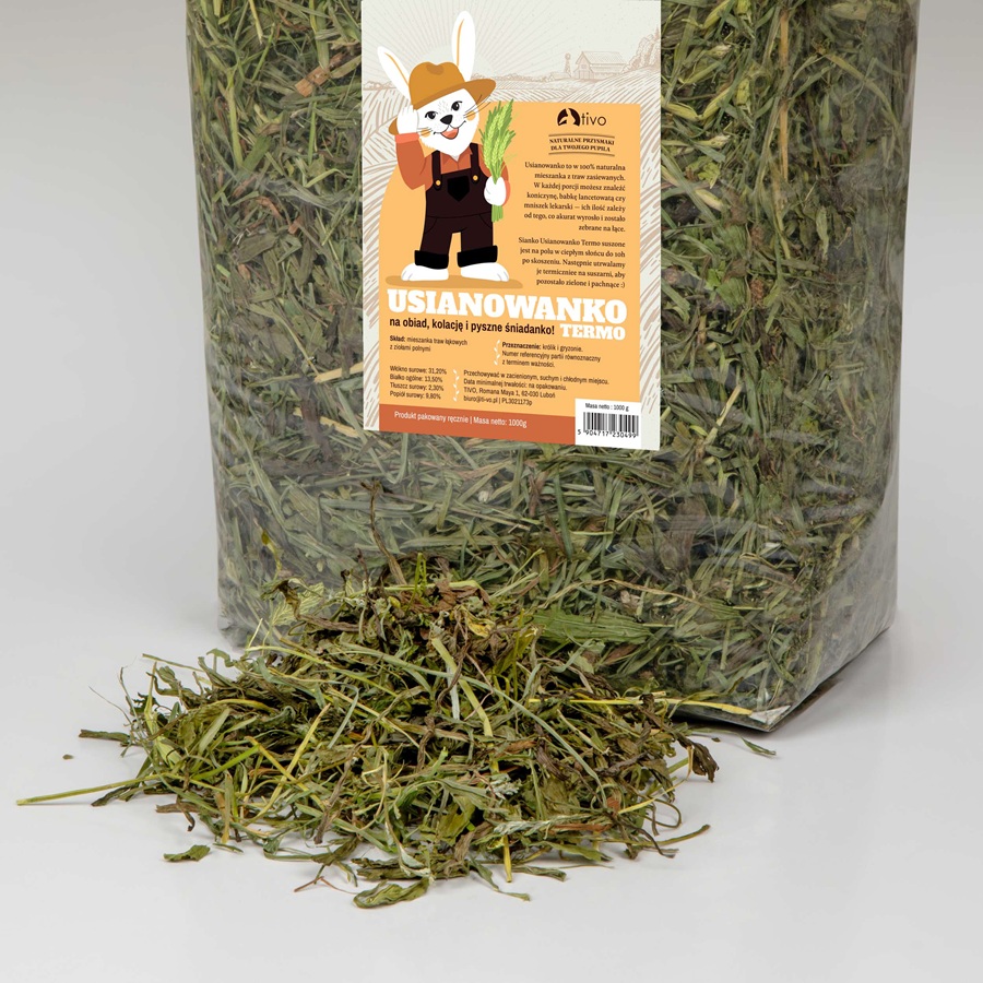 Usianowanko Termo to w 100% naturalna mieszanka traw zasiewanych, pochodzących z czystych łąk. Każda porcja jest unikalna – w zależności od sezonu i zbiorów możesz w niej znaleźć koniczynę, babkę lancetowatą czy mniszek lekarski, czyli rośliny chętnie wybierane przez króliki i gryzonie.