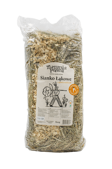 Mazurska Polana Sianko łąkowe z pasternakiem to połączenie aromatycznego, ręcznie zbieranego siana z wartościami odżywczymi pasternaku, tworząc zdrowy i apetyczny dodatek do codziennej diety małych zwierząt.