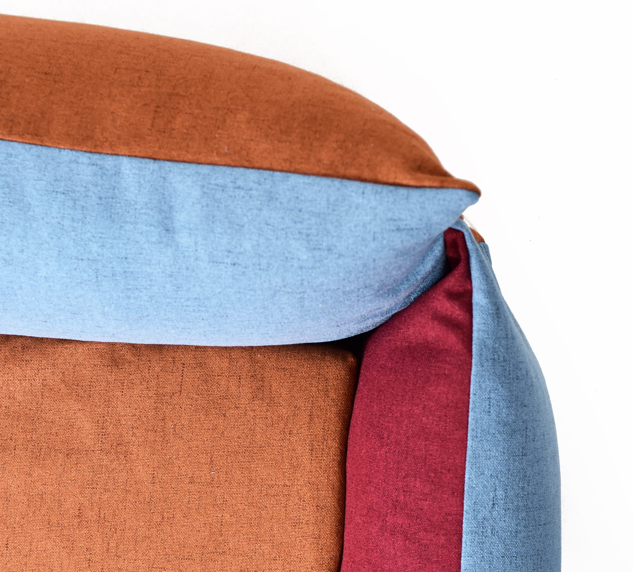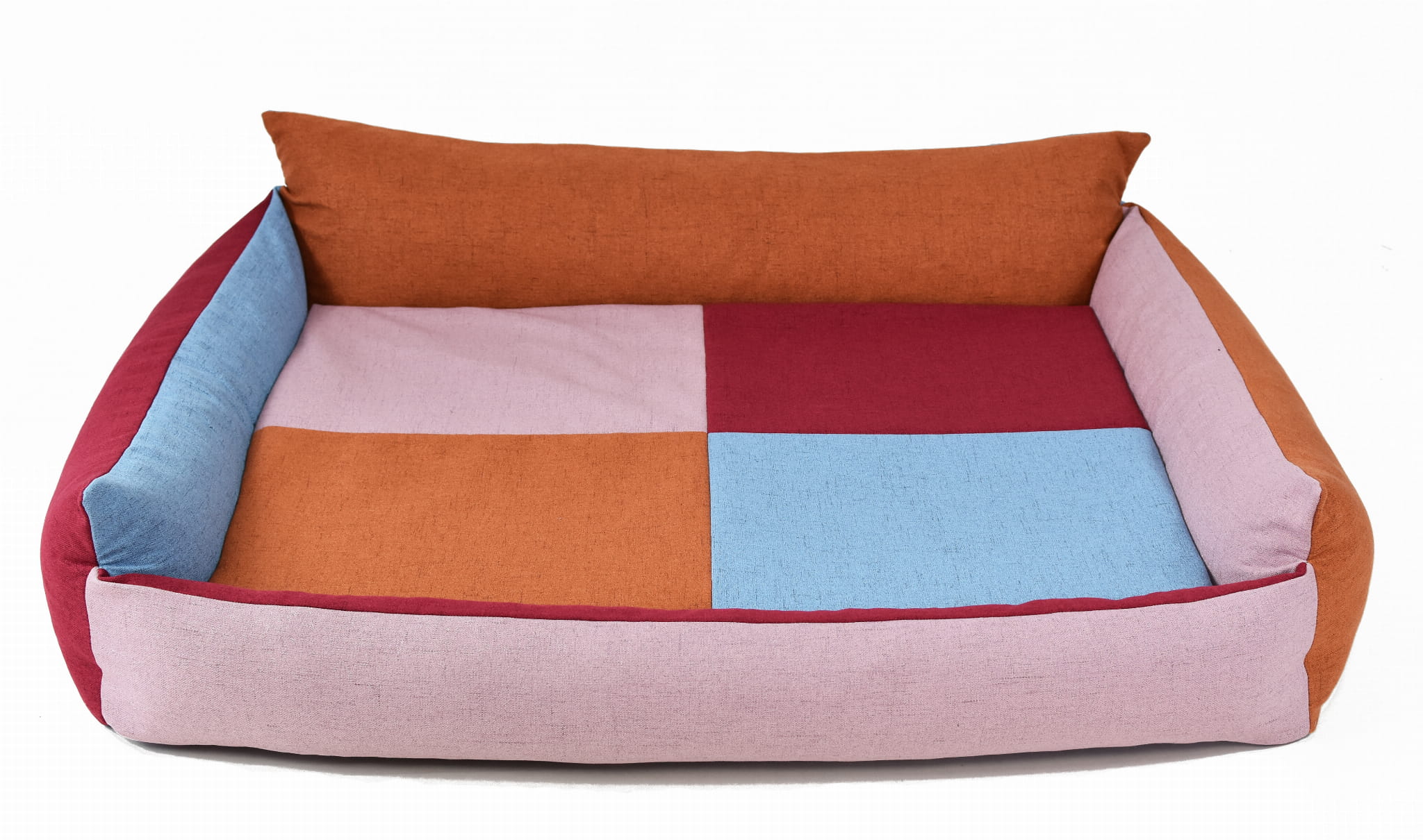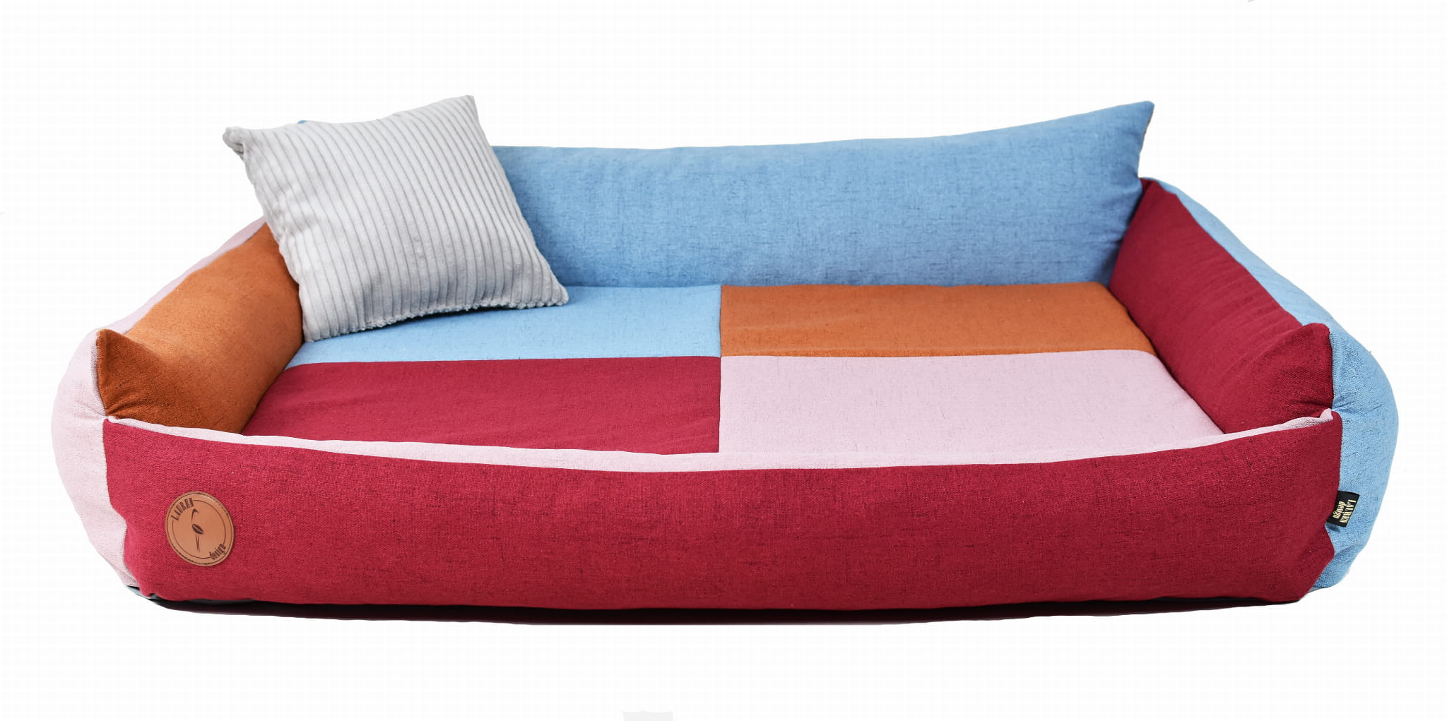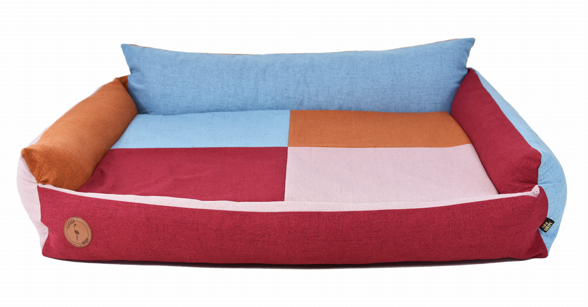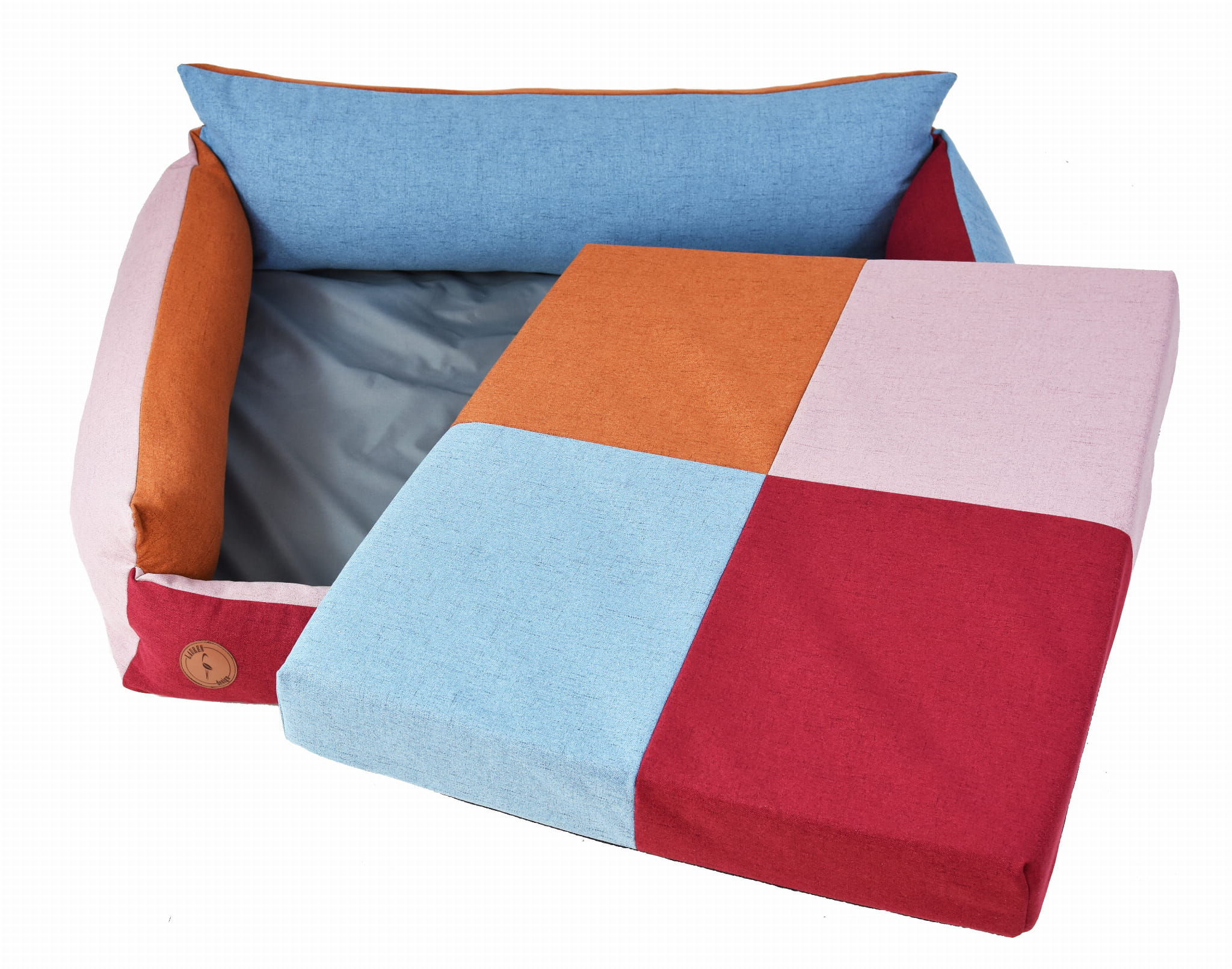 Legowisko zostało uszyte z czterech eleganckich kolorów tkanin, które w połączeniu z odwracalnymi boczkami pozwalają łatwo zmienić wygląd kanapy. W zestawie znajduje się także mała, miękka poduszka 30 × 30 cm w kolorze szarym – idealna do przytulenia lub jako dodatkowe oparcie.