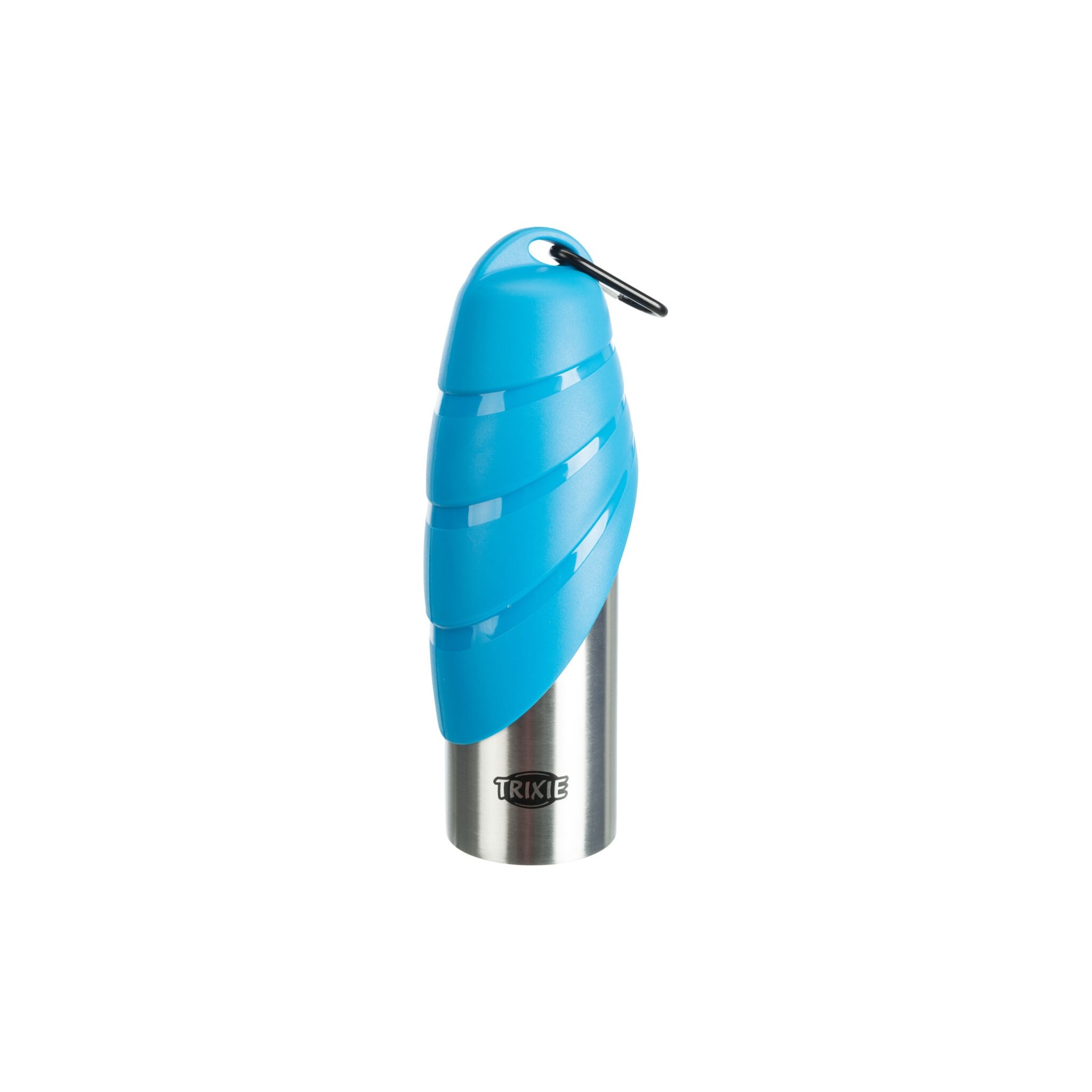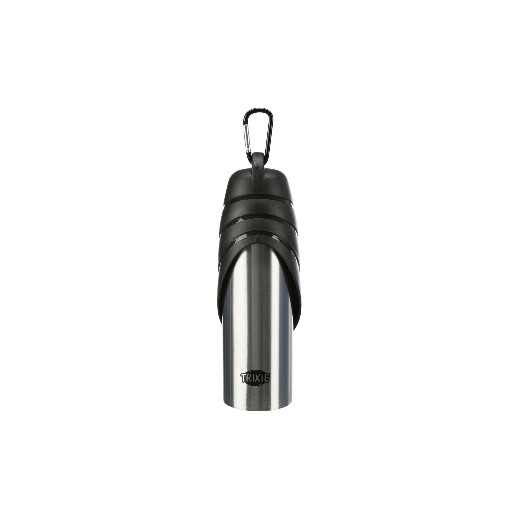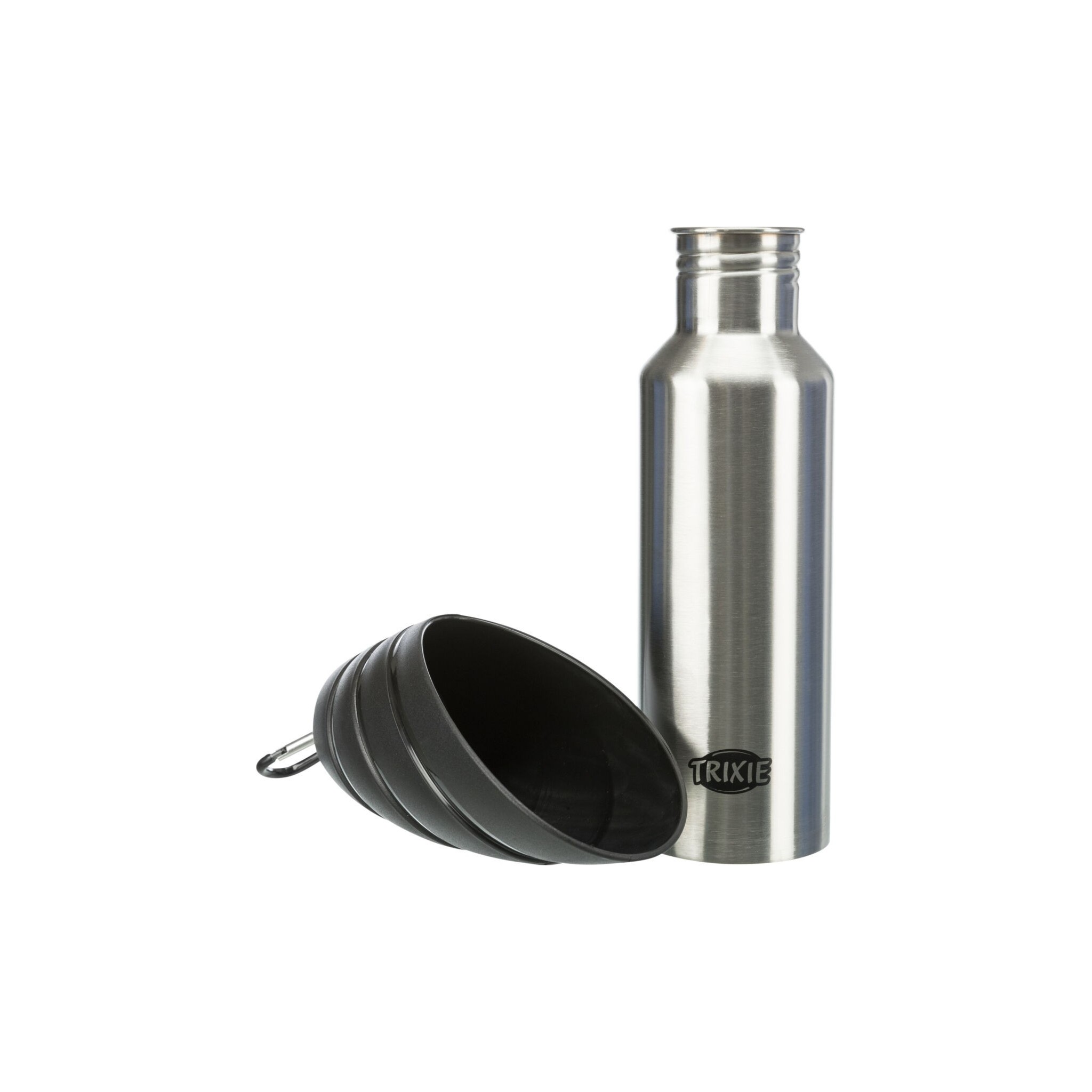 Turystyczna butelka z miską wykonana ze stali nierdzewnej oraz plastiku. Kształt przykrywki umożliwia użycie jej jako miskę w trakcie podróży. Posiada praktyczny haczyk umożliwiający zawieszenie butelki np. na pasek. Kolor wysyłany losowo, zależnie od dostępnej partii towaru.
