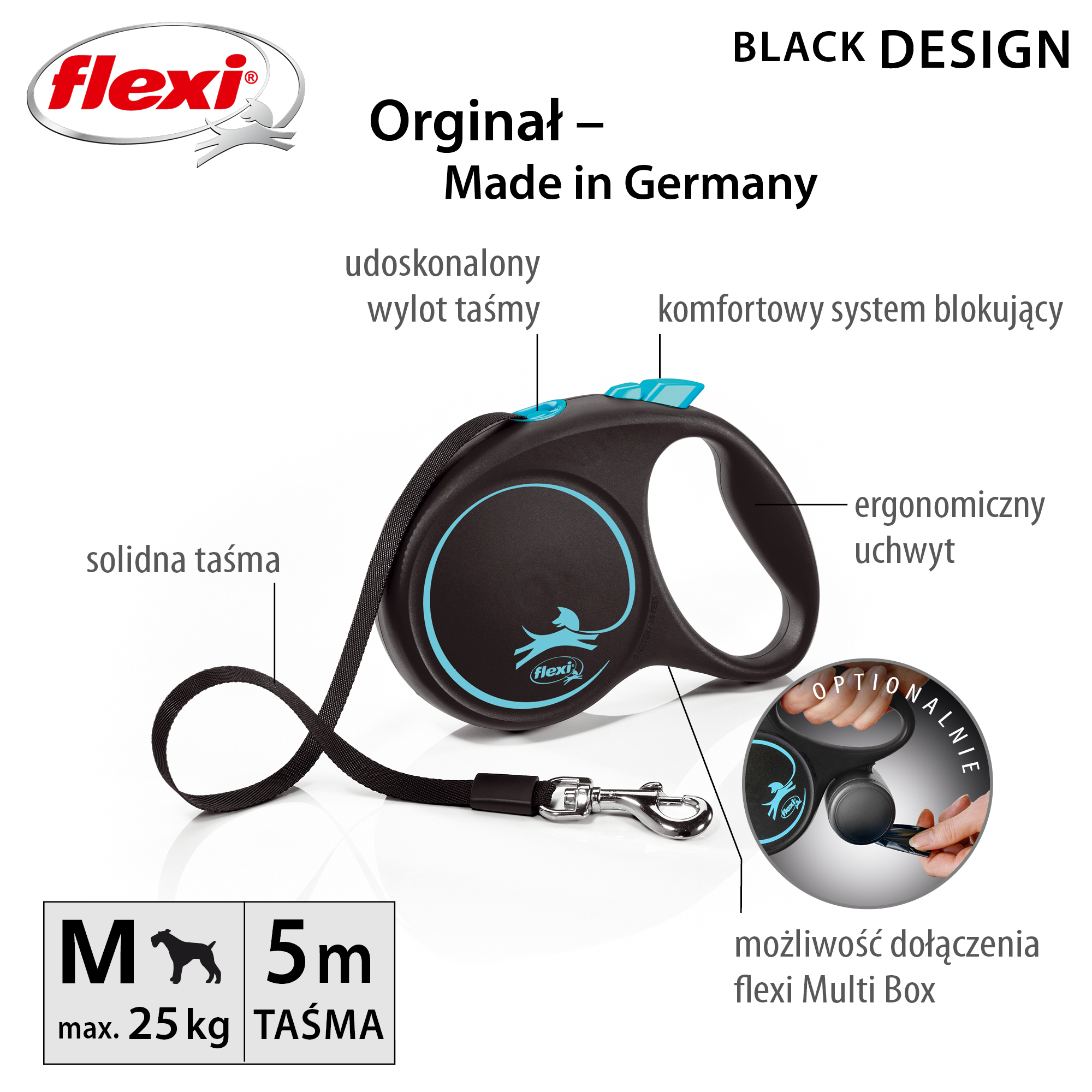 Do smyczy można dołączyć Multibox na woreczki na odchody i lampkę Led Lighting System.