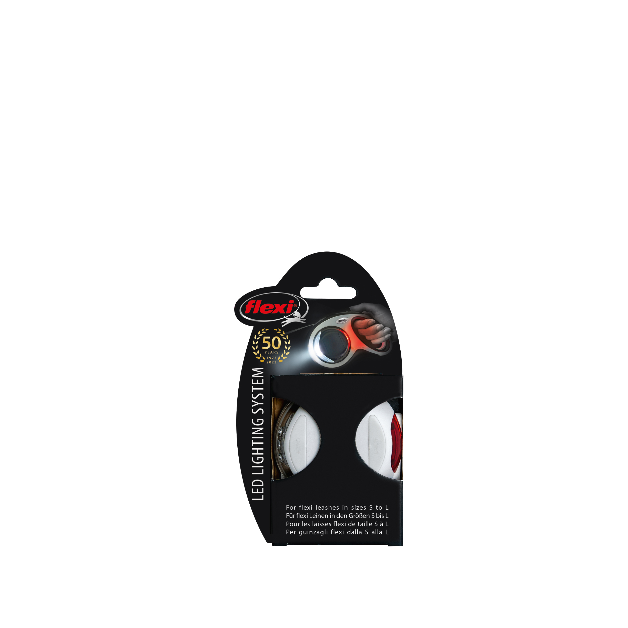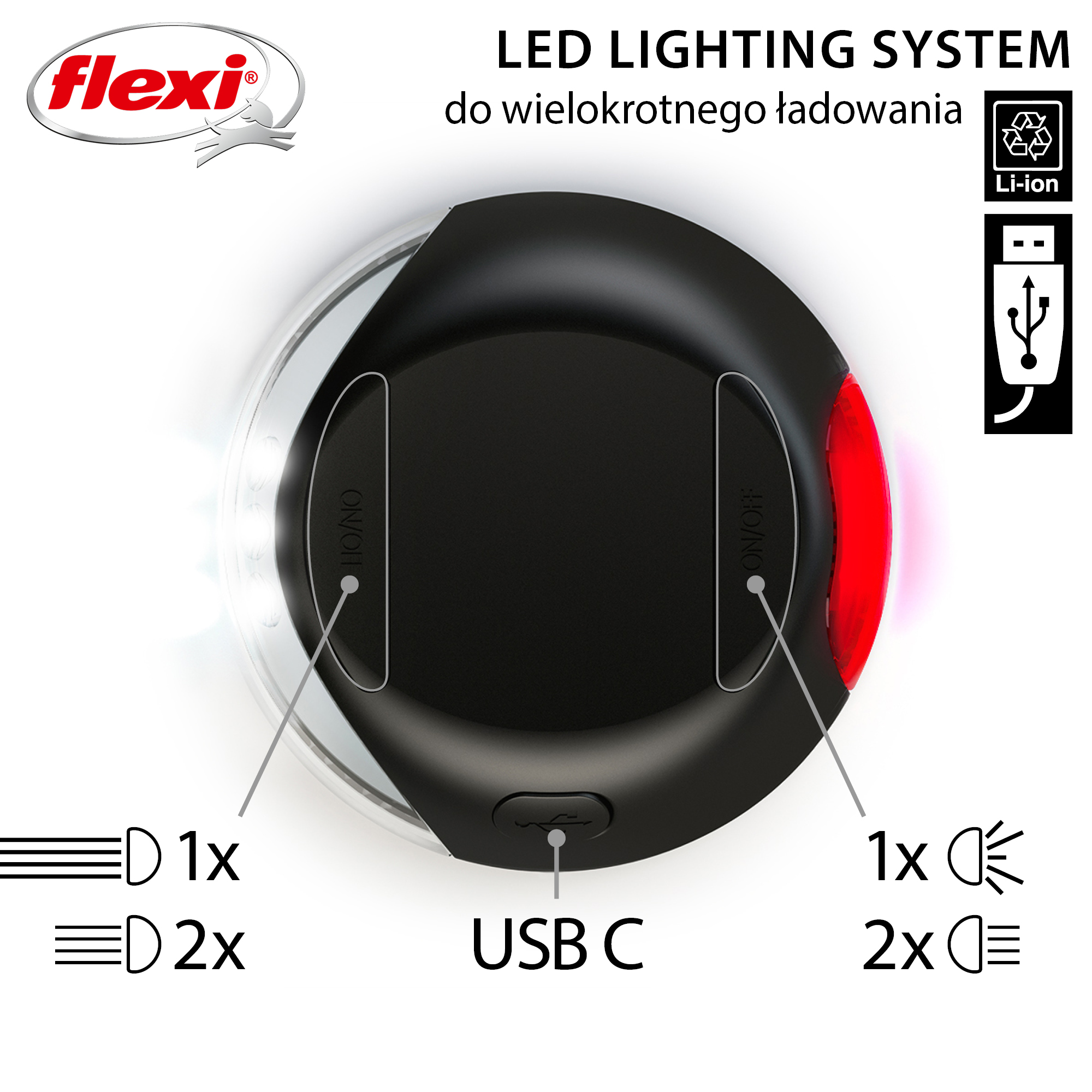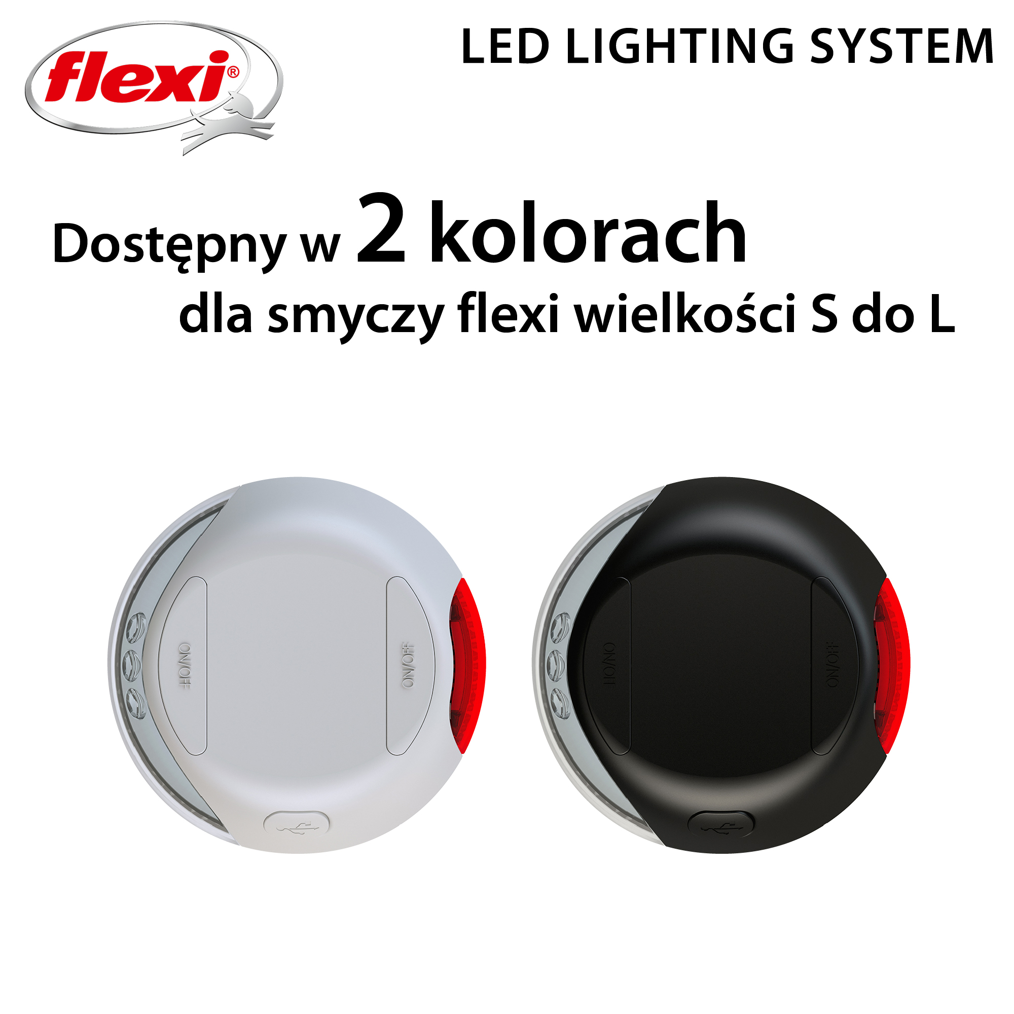 Flexi Led Lighting z akumulatorkiem to lampka LED zintegrowana z systemem smyczy Flexi. Charakteryzuje się bardzo mocnym światłem. Lampka wyposażona jest w światło białe i czerwone. Znajduje zastosowanie między innymi jako dodatkowe oświetlenie (latarka) podczas wieczornych spacerów z psem, zwiększając widoczność i tym samym bezpieczeństwo. Lampa LED pasuje do następujących modeli smyczy Flexi: New Comfort, New Classic i Flexi Vario, w rozmiarach S, M, L.