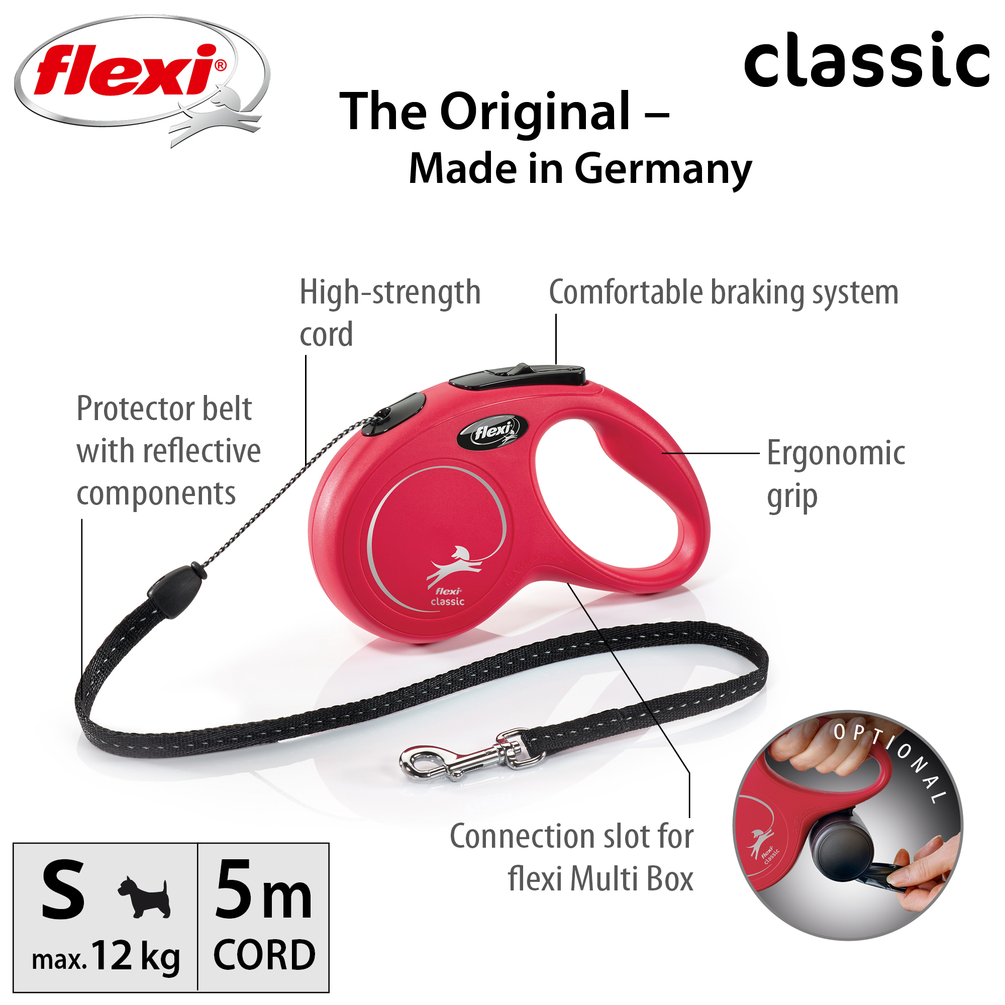 Flexi New Classic to automatyczne smycze, które nigdy nie zwisają, ponieważ zawsze są lekko naciągnięte. Za pomocą wbudowanego systemu hamowania zawsze można mieć wpływ na psa. Ponadto smycz jest blokowana za pomocą dodatkowego przycisku.