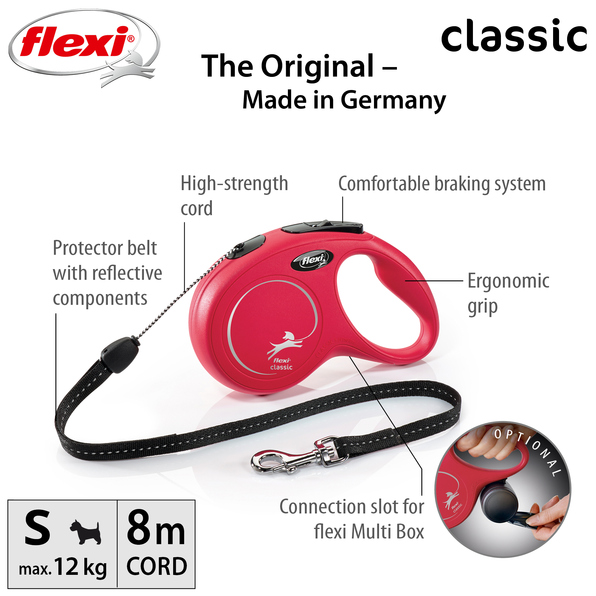 Flexi New Classic to automatyczne smycze, które nigdy nie zwisają, ponieważ zawsze są lekko naciągnięte. Za pomocą wbudowanego systemu hamowania zawsze można mieć wpływ na psa. Ponadto smycz jest blokowana za pomocą dodatkowego przycisku.