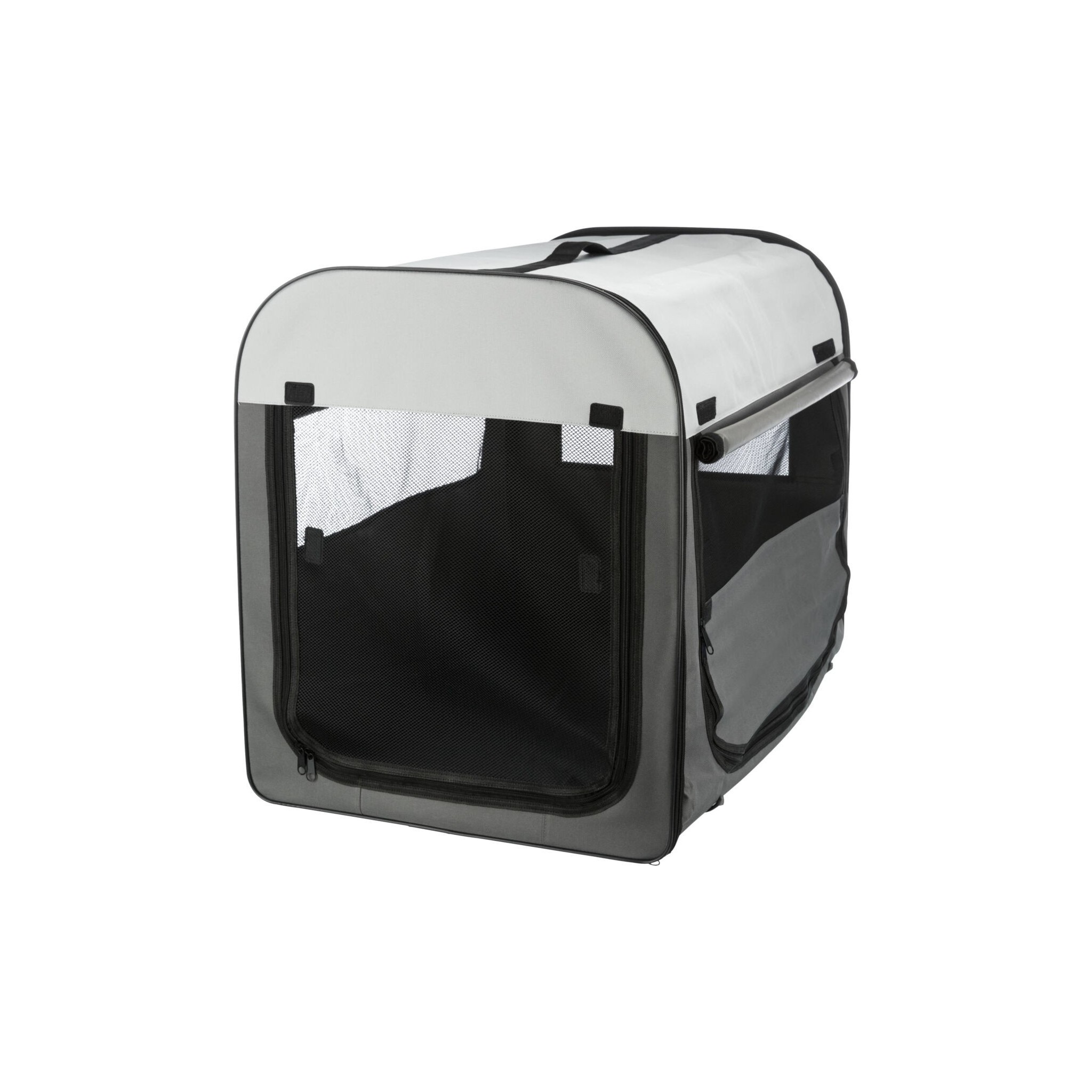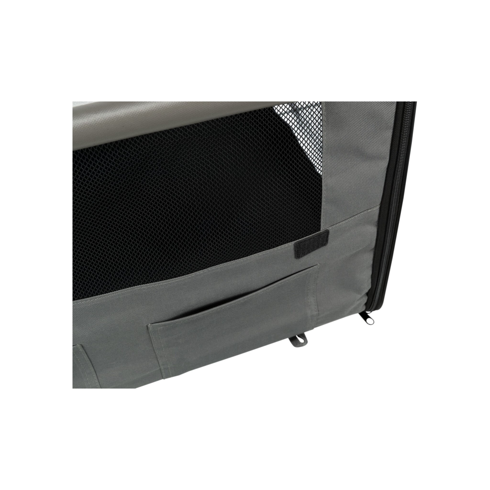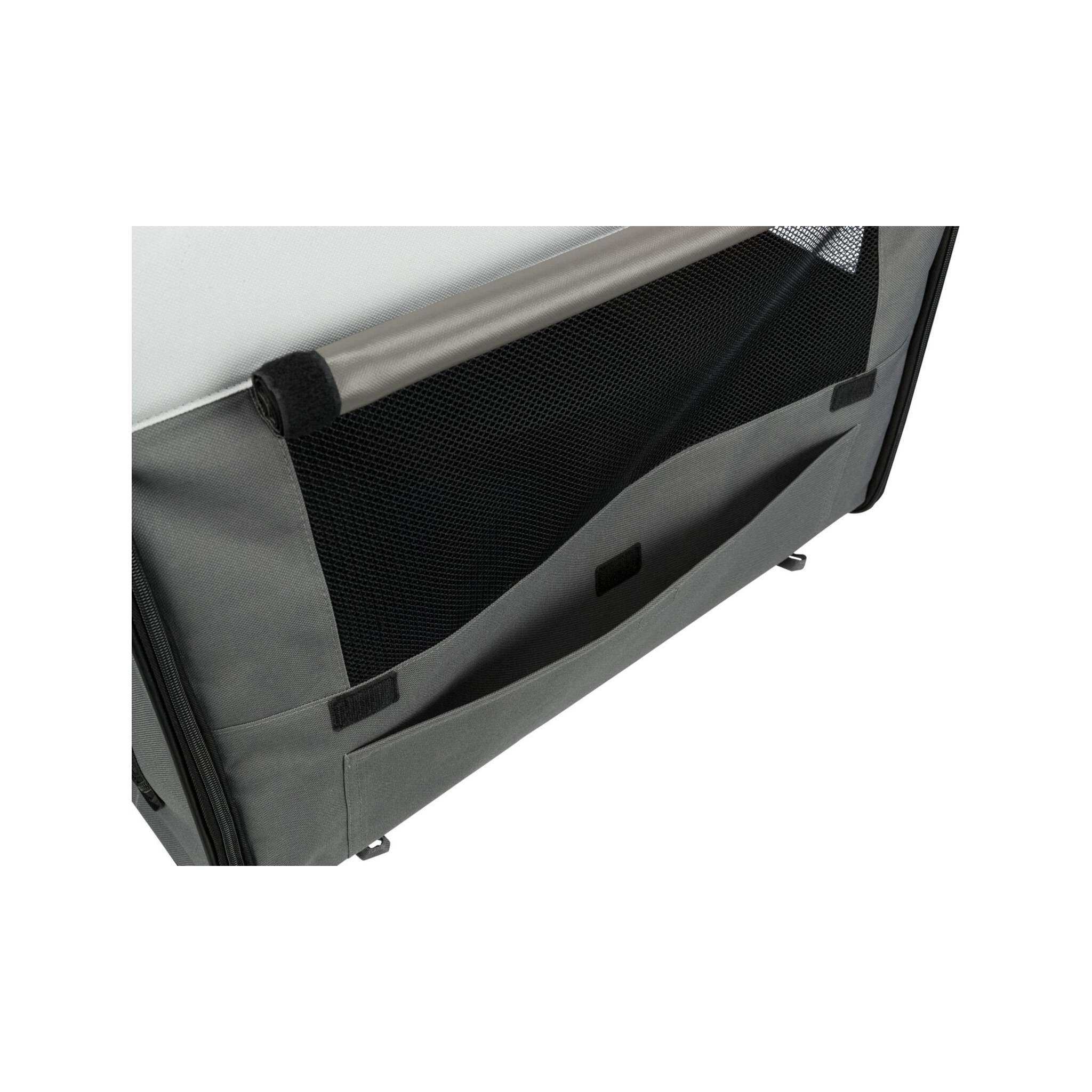 Transporter z materiału w kolorze beżowo-niebieskim. Przeznaczony do transportu psów, kotów i innych zwierząt. Jest to idealne miejsce dla Twojego zwierzaka w domu lub podczas podróży. Siatka zapewnia dobrą cyrkulacje powietrza. Ten transporter chroni przed zimnem podłogi. Trzy kieszenie boczne to idealne miejsce na przekąski czy akcesoria. Transporter można złożyć i schować w nylonowy worek który jest w zestawie. Wymiary: 55×65×80cm