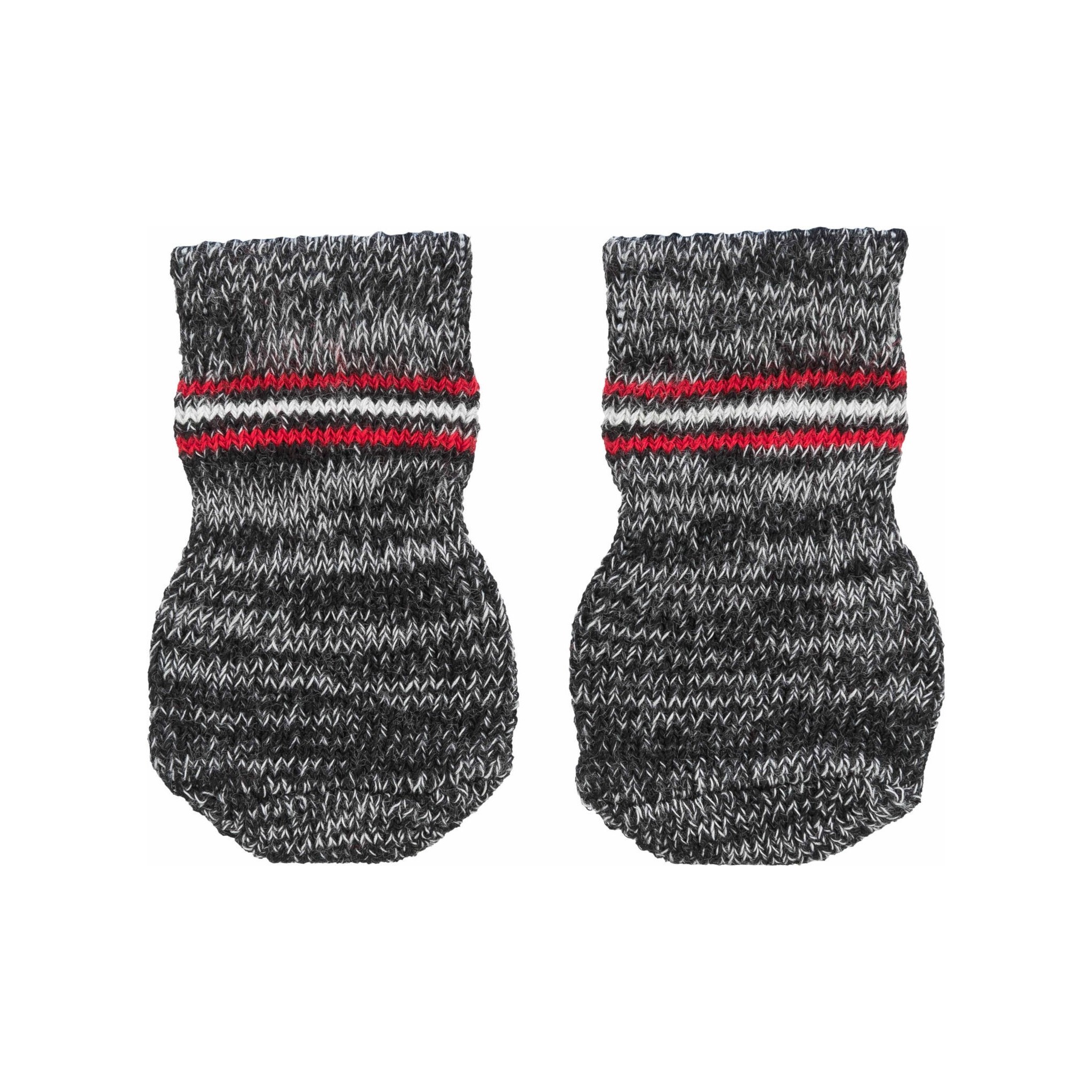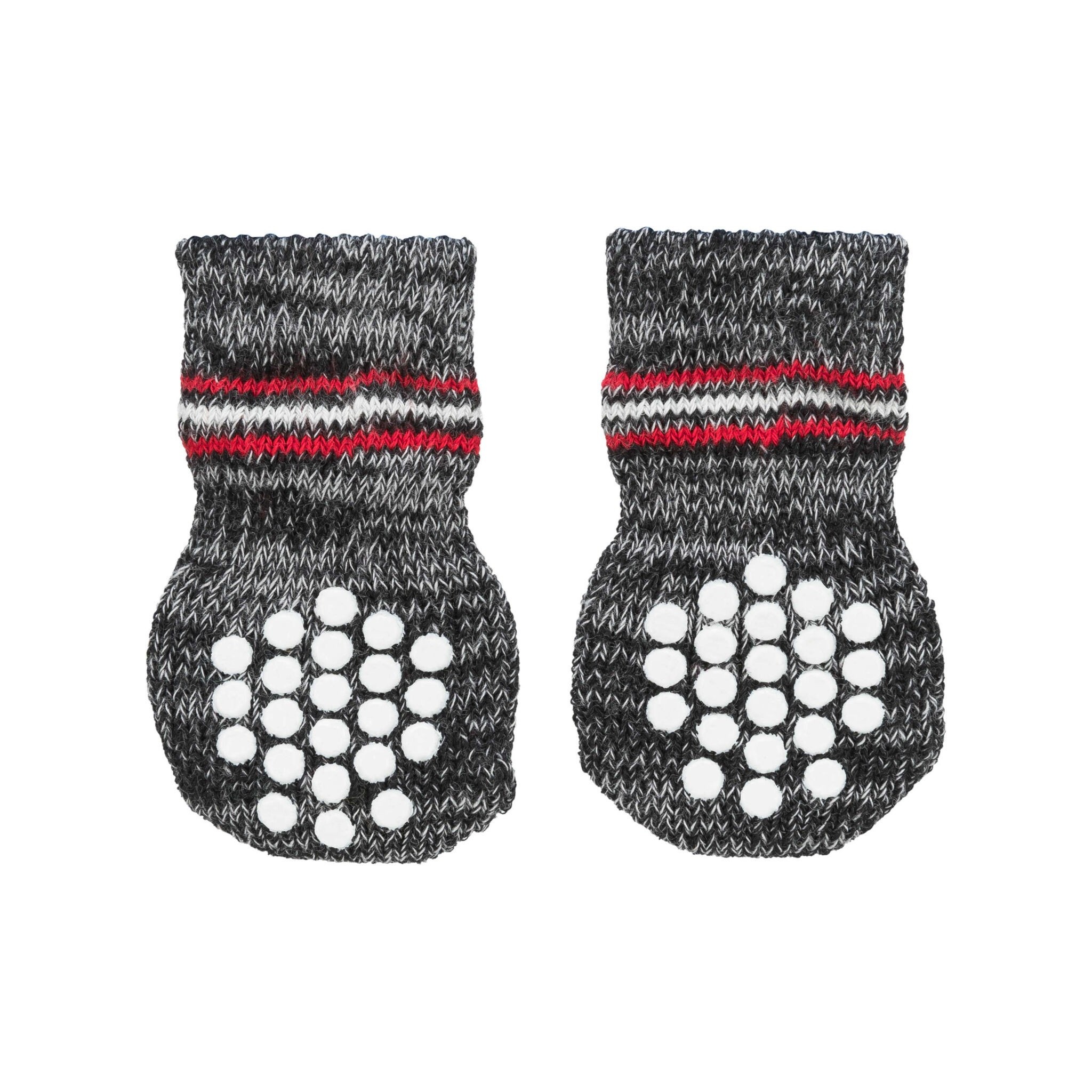 Skarpetki antypoślizgowe dla psa wykonane z bawełny. Posiadają powłokę antypoślizgową w postaci gumowych kropek. Dodatkowo skarpetka nadaje się ochrony mniejszych ran oraz stanowi idealne zabezpieczenie łapy. Skarpeta dostępna w kolorze szarym. W skład kompletu wchodzą dwie skarpety.