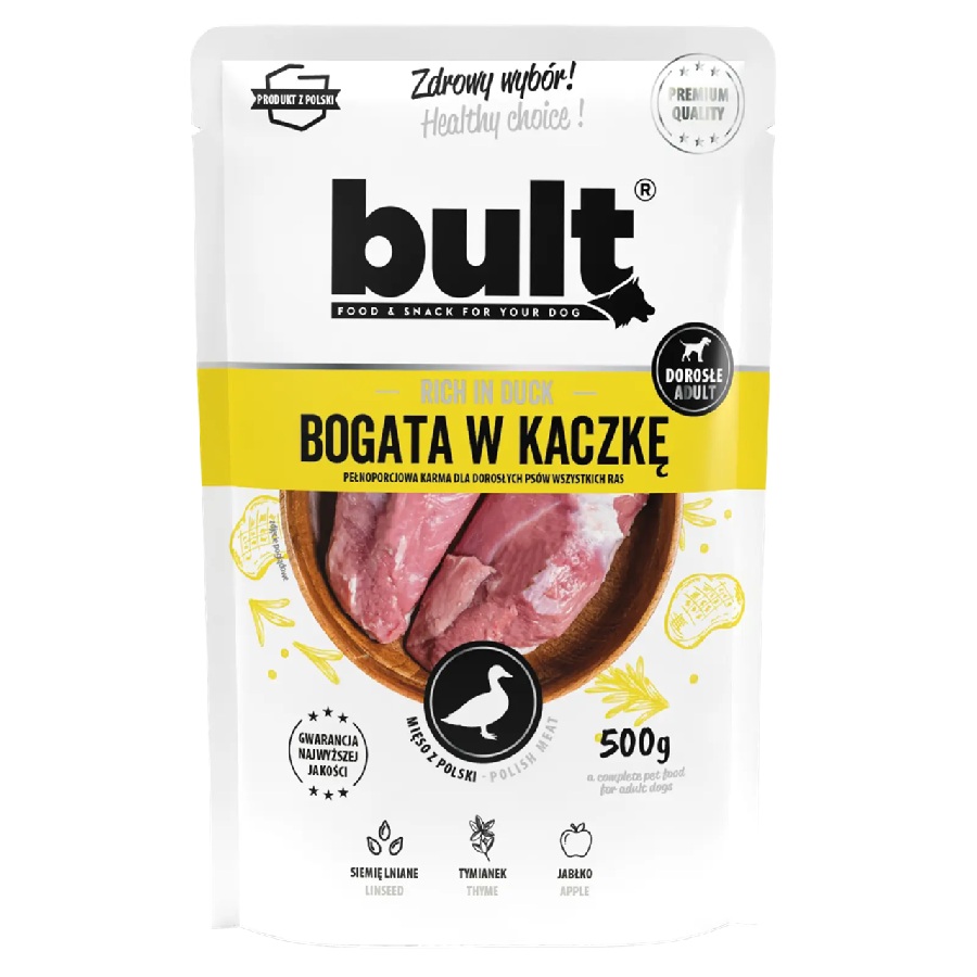 Bult bogata w kaczkę to pełnoporcjowa karma mokra, która łączy wysoką zawartość mięsa z dobroczynnymi dodatkami roślinnymi. Receptura oparta na 75% mięsa i produktów pochodzenia zwierzęcego, w tym 20% kaczki, stanowi lekkostrawne źródło białka, wspierające kondycję, zdrowie i witalność pupila.