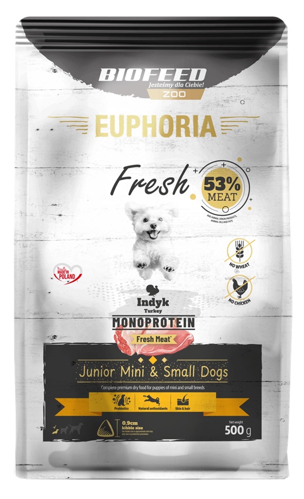 Euphoria Fresh Junior XS/S to pełnoporcjowa i monoproteinowa karma sucha dla szczeniąt ras małych i miniaturowych.