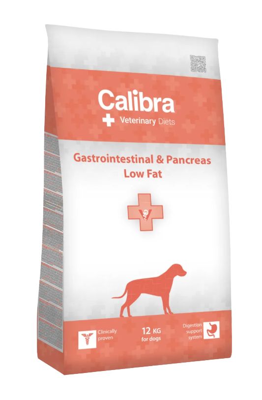 Calibra Dog VET 12kg Gastro & Pancreas Low Fat to pełnoporcjowa karma weterynaryjna dla psów dorosłych z zaburzeniami wchłaniania jelitowego, zaburzeniami trawienia, zewnątrzwydzielniczą niewydolnością trzuski.