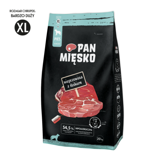Pan Mięsko wyróżnia się tym, że został przygotowany z mięsa czyli najbardziej wartościowych mięśni szkieletowych, które dostarczają dobrze przyswajalne białko. Pan Mięso jest hipoalergiczny, dzięki hydrolizie białek, która dzieli białka na mniejsze części, dzięki czemu układ immunologiczny nie identyfikuję ich jako alergeny. Małe cząsteczki nie wywołują reakcji alergicznej, dlatego karma jest polecana dla psich alergików.