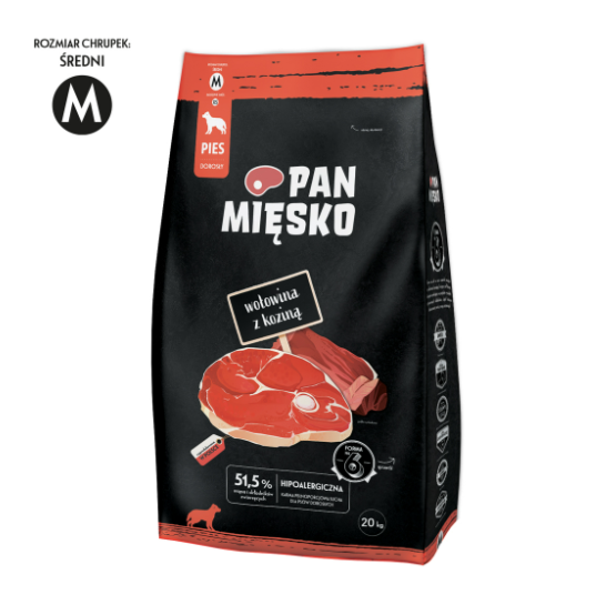Pan Mięsko wyróżnia się tym, że został przygotowany z mięsa czyli najbardziej wartościowych mięśni szkieletowych, które dostarczają dobrze przyswajalne białko. Pan Mięso jest hipoalergiczny, dzięki hydrolizie białek, która dzieli białka na mniejsze części, dzięki czemu układ immunologiczny nie identyfikuję ich jako alergeny. Małe cząsteczki nie wywołują reakcji alergicznej, dlatego karma jest polecana dla psich alergików.