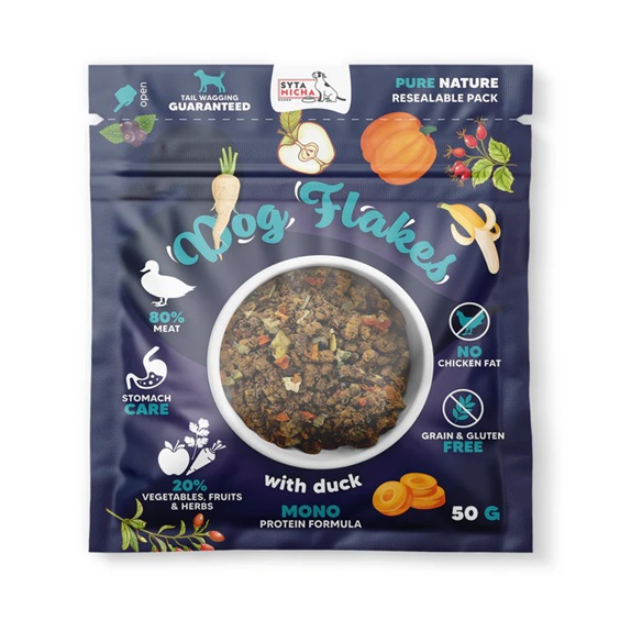 Syta Micha Dog Flakes to monobiałkowa, hipoalergiczna karma suszona ciepłym powietrzem, stanowiąca wygodną i bezpieczną alternatywę dla diety BARF. Zbilansowana formuła 80/20 zawiera 80% najwyższej jakości mięsa oraz 20% odżywczych warzyw, owoców i SUPERFOODS. Bez zbóż, glutenu i sztucznych dodatków. Idealna dla psów z wrażliwym układem pokarmowym i alergików.