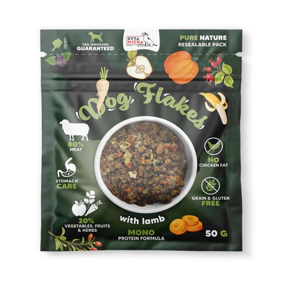 Syta Micha Dog Flakes z Jagnięciną to przełomowa, suszona powietrzem karma, która łączy naturalne składniki surowej diety z wygodą i trwałością karmy suchej. Ta monobiałkowa, hipoalergiczna formuła została stworzona przez dietetyka i zawiera aż 80% najwyższej jakości mięsa jagnięcego (w tym mięso mięśniowe i odżywcze podroby) oraz 20% warzyw, owoców i SUPERFOODS. To pełnowartościowy i lekkostrawny posiłek dla dorosłych psów wszystkich ras, w tym alergików i psów z wrażliwym układem pokarmowym.