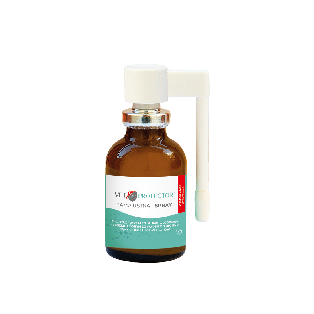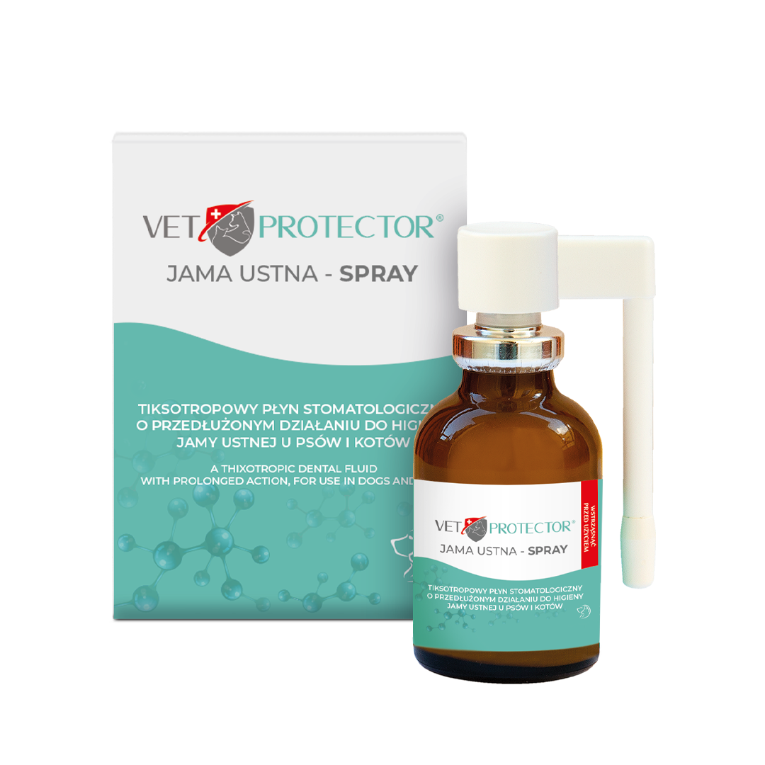 Vet Protector Jama Ustna Spray to innowacyjny preparat do codziennej pielęgnacji jamy ustnej psów i kotów. Dzięki unikalnej tiksotropowej formule spray mocno przylega do zębów i dziąseł, tworząc niewidoczną barierę ochronną, która wspiera naturalny mikrobiom i chroni przed działaniem bakterii, wirusów i grzybów.