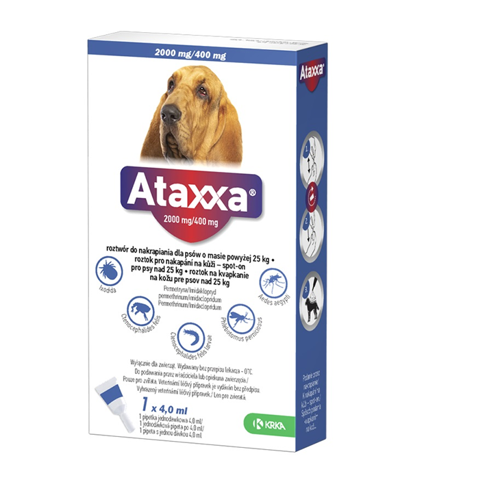 Ataxxa jest lekiem przeznaczonym dla psów powyżej 25 kg masy ciała. Zapobiega i zwalcza inwazji pcheł, działa roztoczobójczo i odstraszające wobec kleszczy, a także odstrasza komary i muchówki.