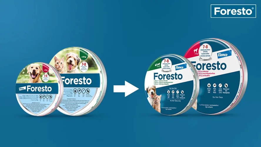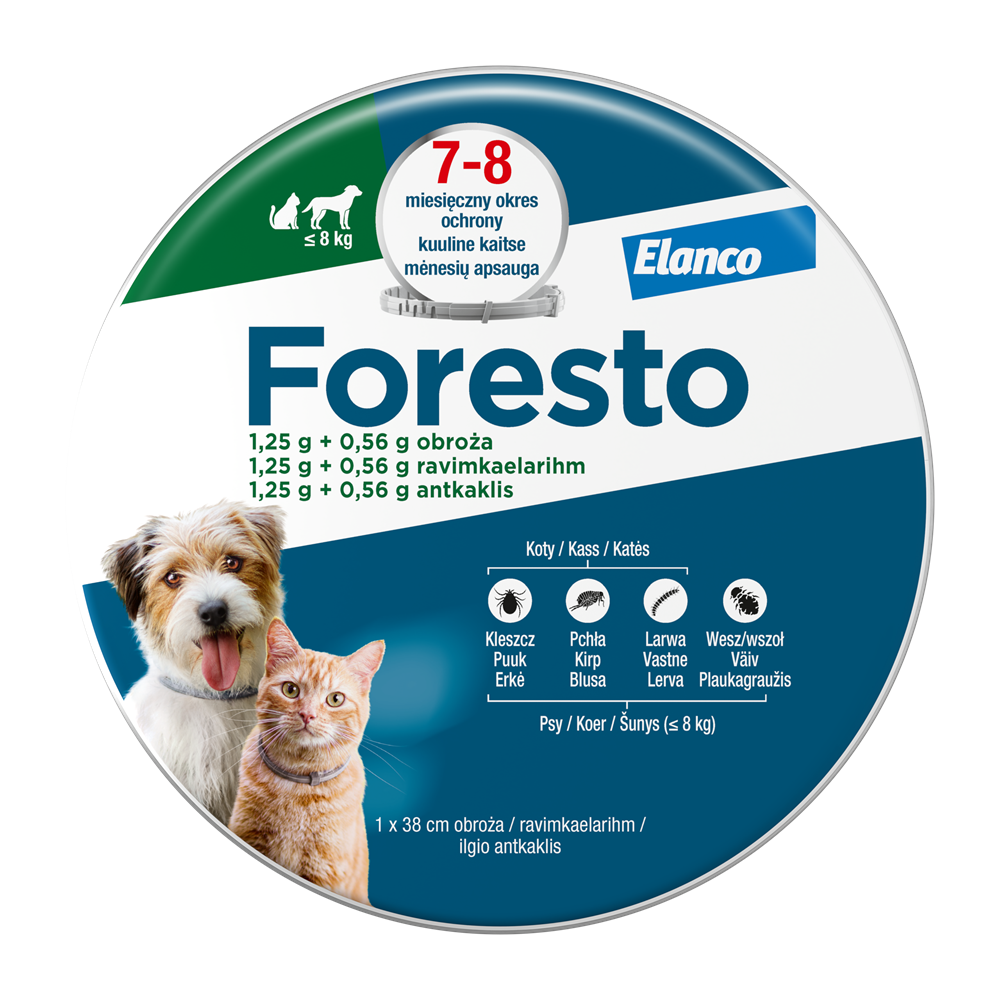 Foresto to obroża przeznaczona dla małych psów oraz kotów o masie ciała równej lub mniejszej niż 8kg. Wodoodporna obroża o długości 38cm zapewnia ochronę przed najbardziej rozpowszechnionymi gatunkami pcheł i kleszczy przez okres aż do 8 miesięcy. Składnikami czynnymi obroży są imidakloprid i flumetryna.