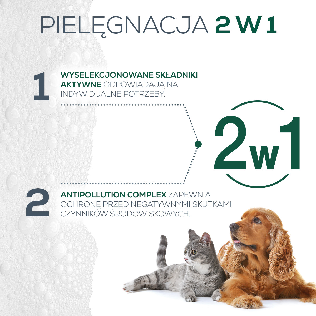 Dzięki ANTIPOLLUTION COMPLEX, odżywka chroni skórę i okrywę włosową przed zanieczyszczeniami środowiska oraz działaniem wolnych rodników. Substancje neutralizujące żółte odcienie zapobiegają przebarwieniom, a ekstrakt z perły nadaje sierści zdrowy blask i miękkość.