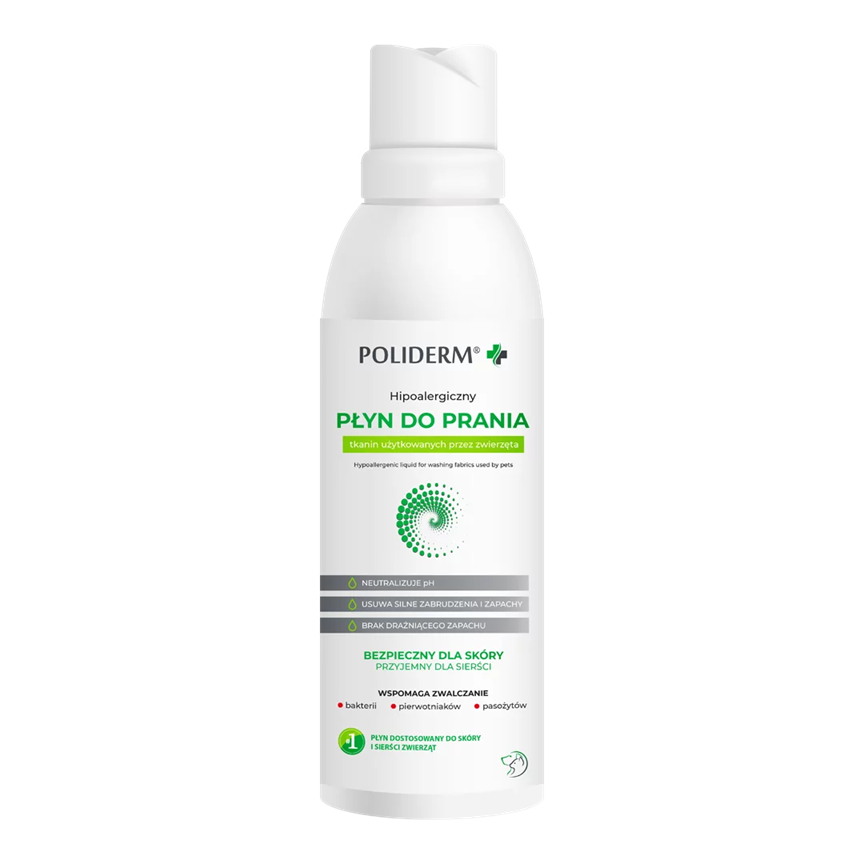 Poliderm Hipoalergiczny płyn do prania to specjalistyczny, hipoalergiczny płyn do prania tkanin przeznaczony dla zwierząt domowych oraz ich opiekunów. Dzięki neutralnemu pH i łagodnej formule jest całkowicie bezpieczny dla alergików oraz zwierząt ze skłonnościami do podrażnień i reakcji alergicznych.