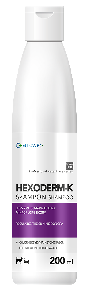 Hexoderm-K to specjalistyczny preparat pielęgnacyjny dla zwierząt, wspierający zdrowie skóry w trakcie terapii dermatologicznych.