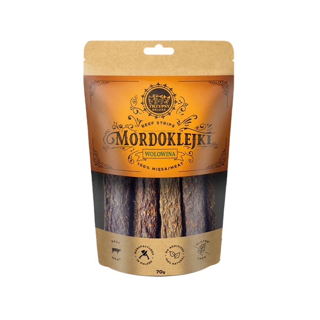 Mordoklejki Trzypsy to naturalny gryzak w formie pasków wykonany w 100% z mięsa.
