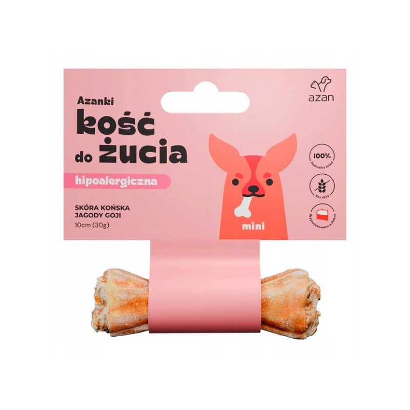 Azanki Kość do żucia MINI ze skóry końskiej z jagodami goji 10cm to przysmak dla psów ras miniaturowych i małych.