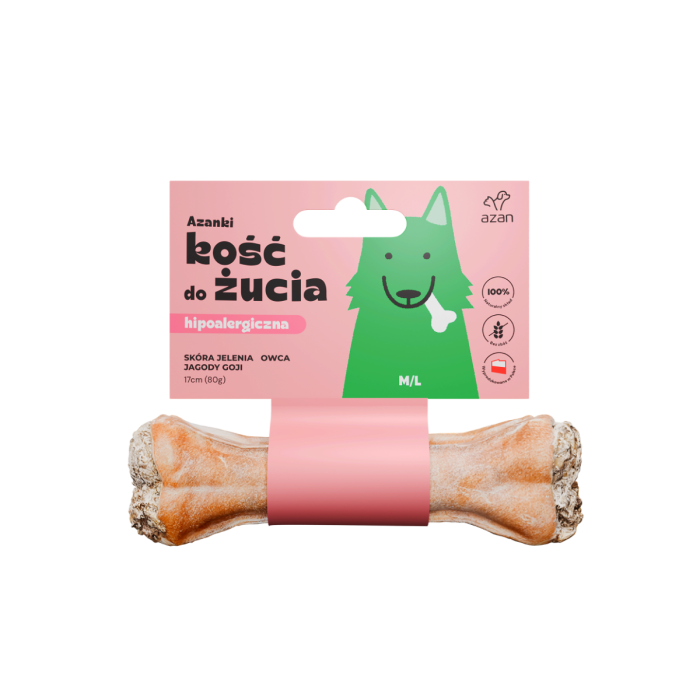 Azanki Kość do żucia M/L ze skóry jelenia z owcą i jagodami goji 17cm to przysmak dla dorosłych psów ras średnich i dużych.
