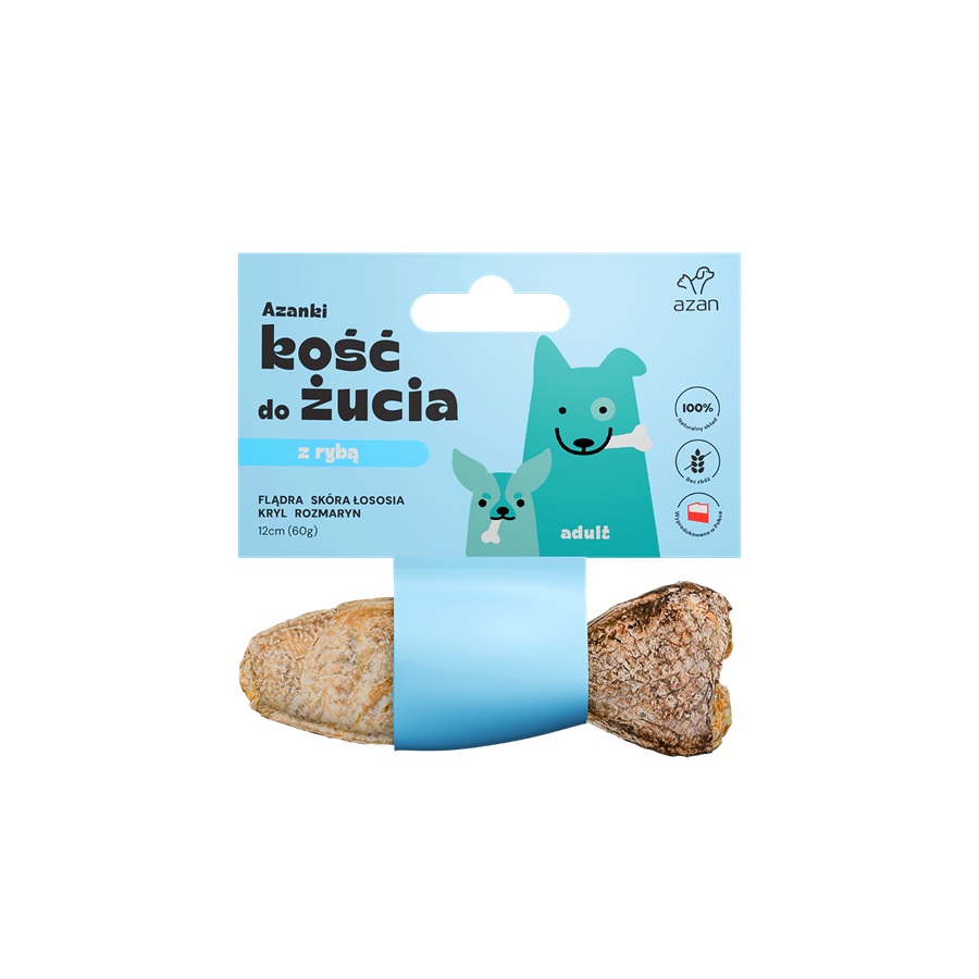 Azanki Kość do żucia Adult z flądrą, rozmarynem i krylem w skórze łososia to pyszny i zdrowy przysmak dla dorosłych psów ras małych i średnich. Zaspokaja naturalną potrzebę gryzienia i żucia, jednocześnie będąc bezpieczną alternatywą dla ostrych i kruchych gryzaków.