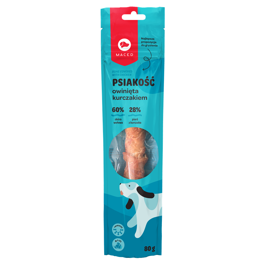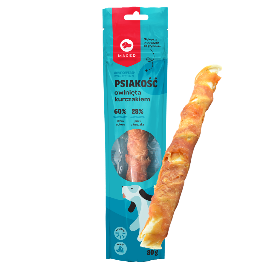 Psiakość pałka owinięta kurczakiem to gryzak ze skóry wołowej owinięty mięsem z kurczakai. Przeznaczony dla średnich i dużych psów.