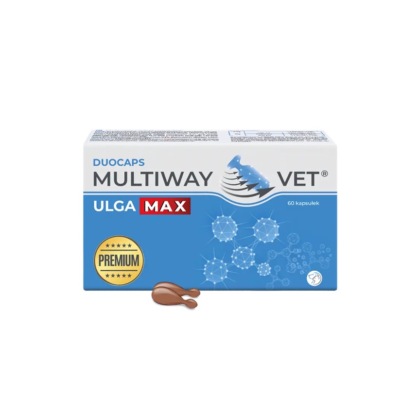 Multiway Vet Duocaps Ulga Max to specjalistyczny preparat weterynaryjny w innowacyjnej formie kapsułek twist-off, opracowany z myślą o redukcji stresu, lęku oraz dyskomfortu bólowego u zwierząt.